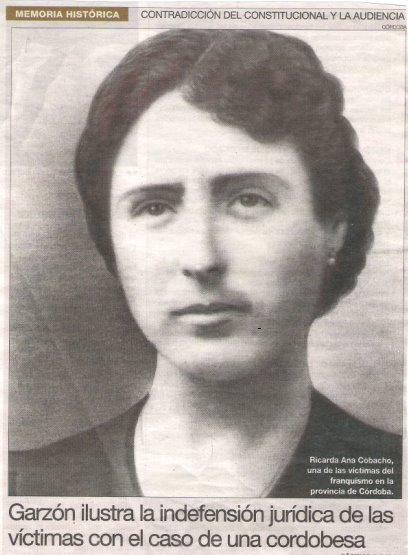 Conviene que nos detengamos en la tragedia sufrida por Ricarda Ana Cobacho Cañete «Ricardita», en la aldea de Jauja. Era una mujer culta, de 36 años, socialista como toda su familia. Tenían una tienda de comestibles y en los ratos libres hacía de maestra particular y de escribiente para la gente que necesitaba cualquier gestión administrativa. Sus cuatro hijos eran menores de edad (el mayor, Juan José, de 13 años). Era una mujer esbelta, agraciada, en un hogar feliz, como tantos otros hogares en aquella España rota por el golpe militar. A comienzos de la República se cruzó en su vida un personaje maldito, que empezó a enviarle notas amenazantes por su campaña para la construcción de una escuela en vez de un cuartel. Se trataba del guardia civil del puesto de Jauja Antonio Velázquez Mateo, de 33 años. Ella no se amilanó, se presentó en la Comandancia de Córdoba y lo denunció. El guardia desvergonzado fue trasladado a Málaga.